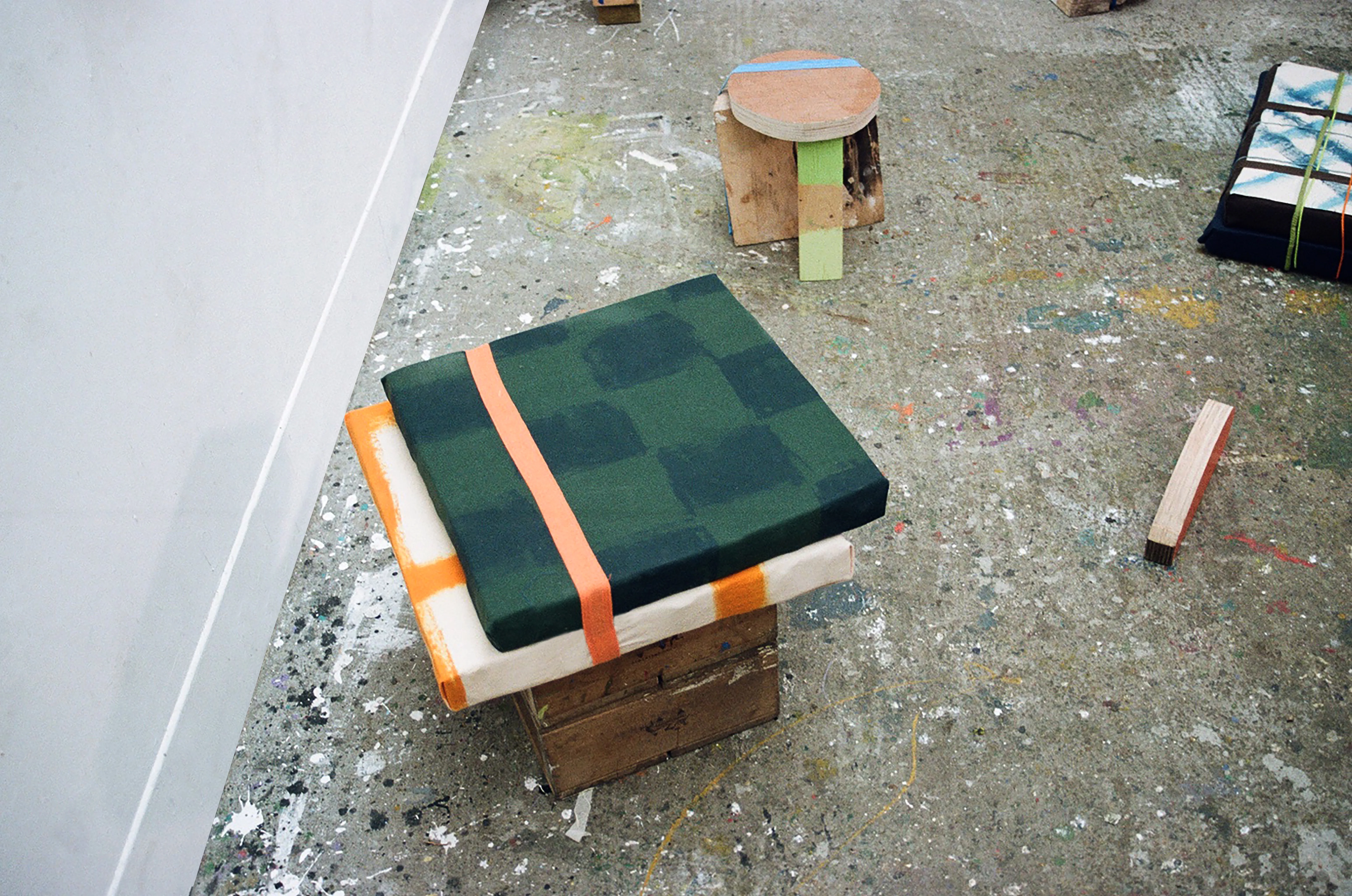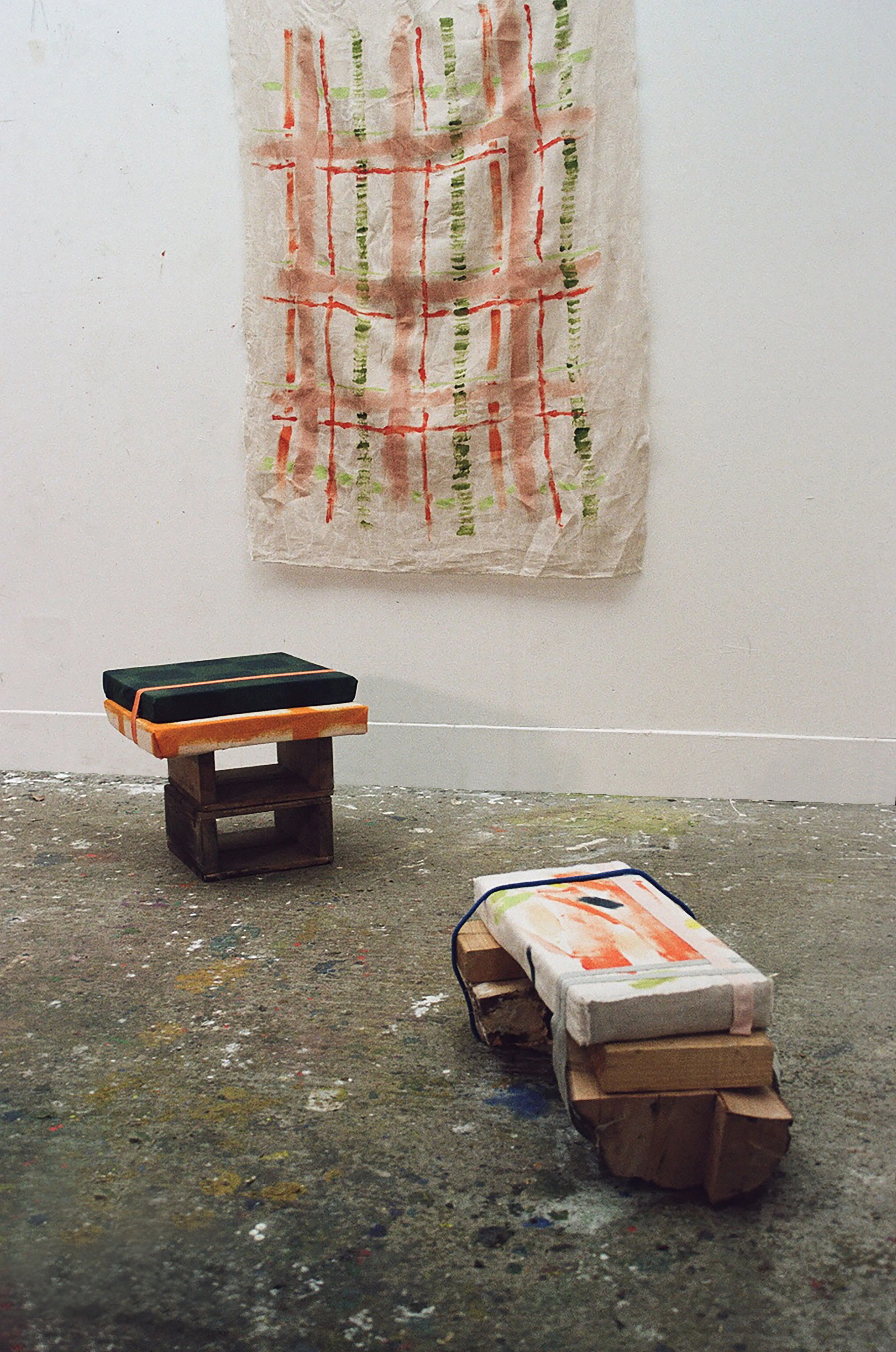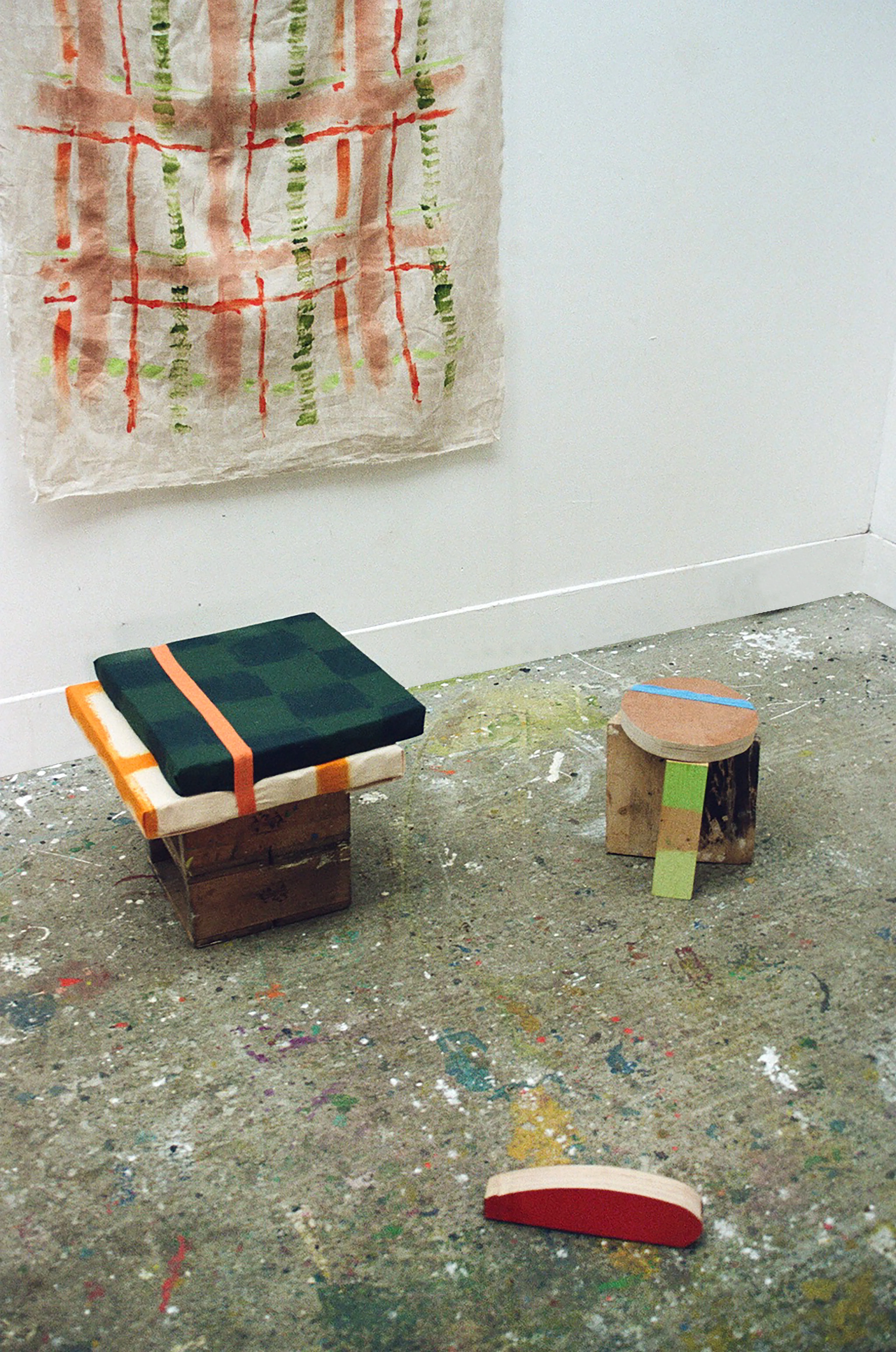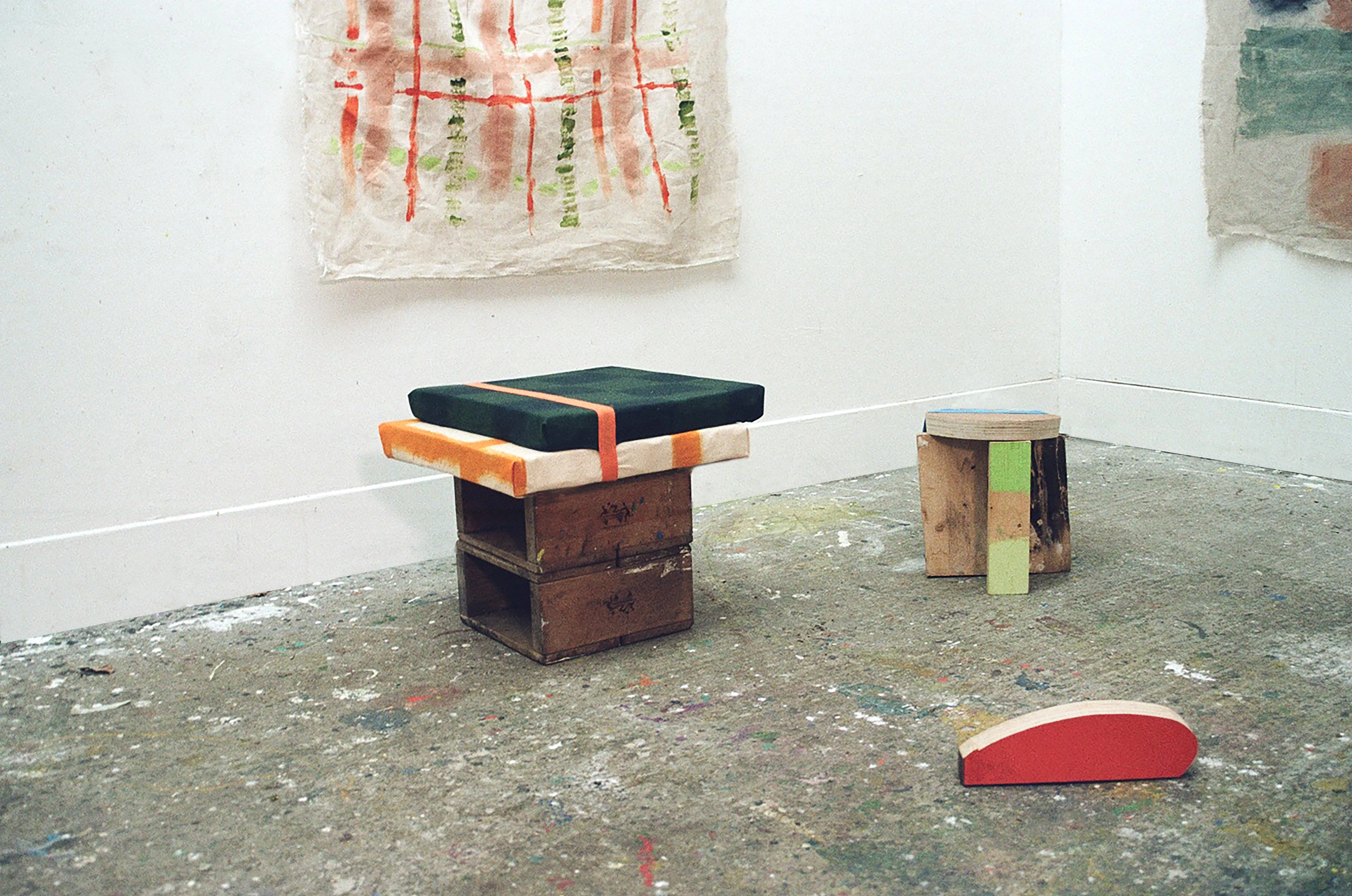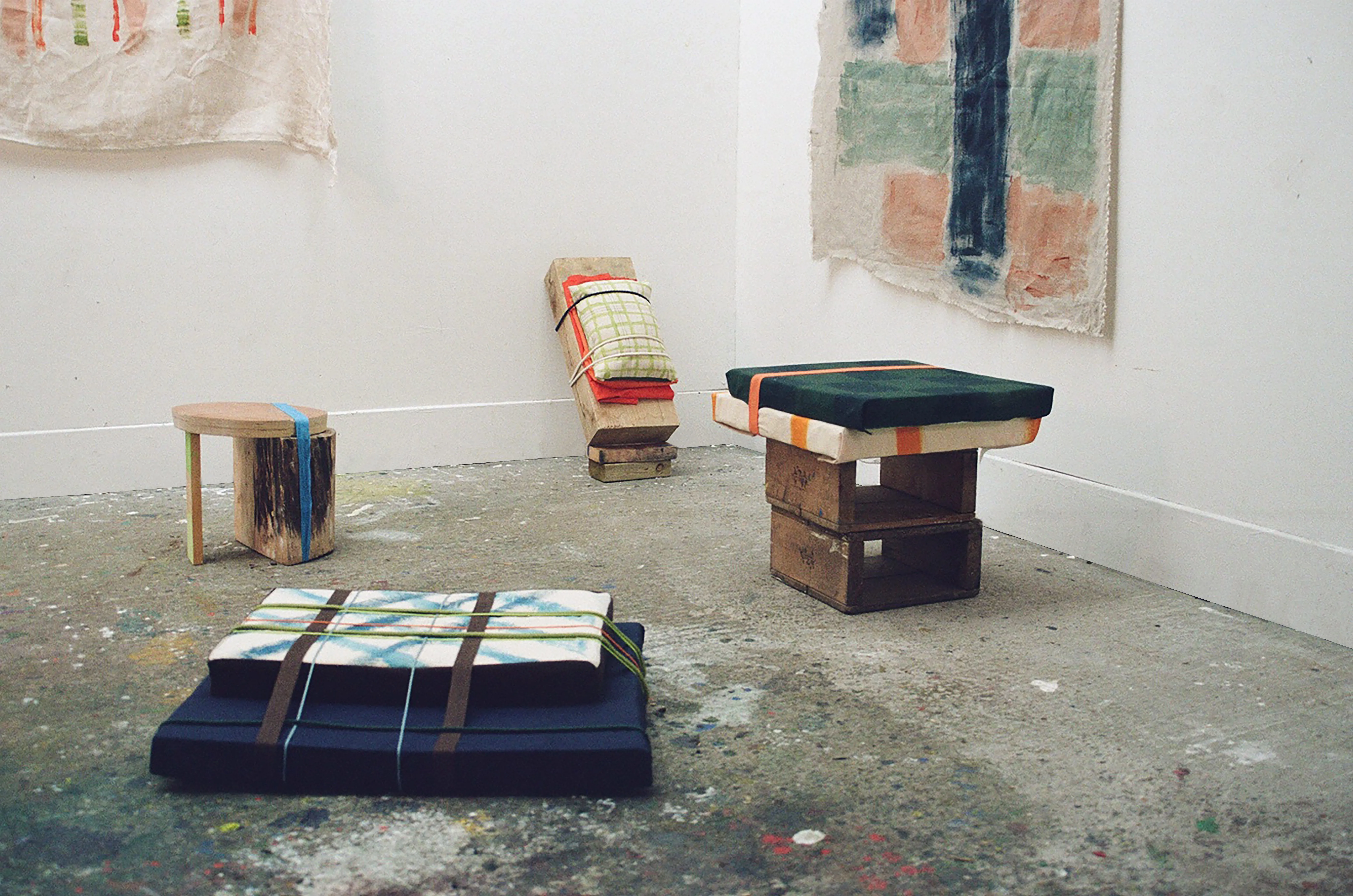 Through an intuitive and process driven approach to making, my project explores the tensions between urban and rural, function and decoration, balance and imbalance, restriction and freedom through the use of hard and soft materials. The relationship between furniture and textiles underpins the work resulting in a collection of sculptural pieces / prototypes. Created by re-purposing materials I gathered and collected from my immediate environment combined with textile processes such as hand painted fabrics and embroidery.